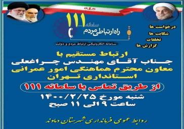ارتباط تلفنی شهروندان با معاون محترم هماهنگی امور عمرانی استانداری تهران از طریق سامانه تلفنی ۱۱۱ برقرار میشود.