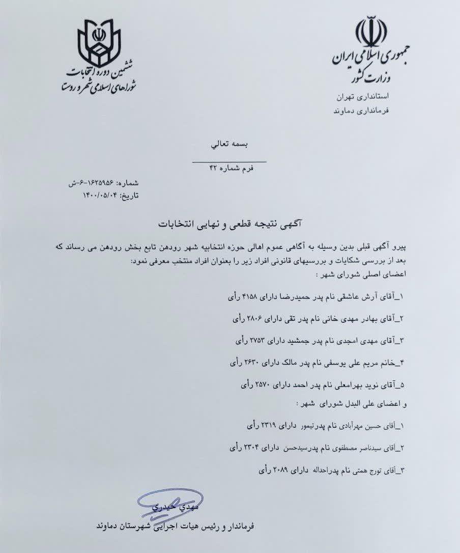 پیرو آگهی قبلی، بدینوسیله به آگهی اهالی حوزه انتخابیه شهر رودهن تابع بخش مرکزی شهرستان دماوند میرساند که بعد از بررسی شکایت و بررسیهای قانونی افراد منتخب به عنوان اعضای شورای اسلامی شهر رودهن معرفی شدند.