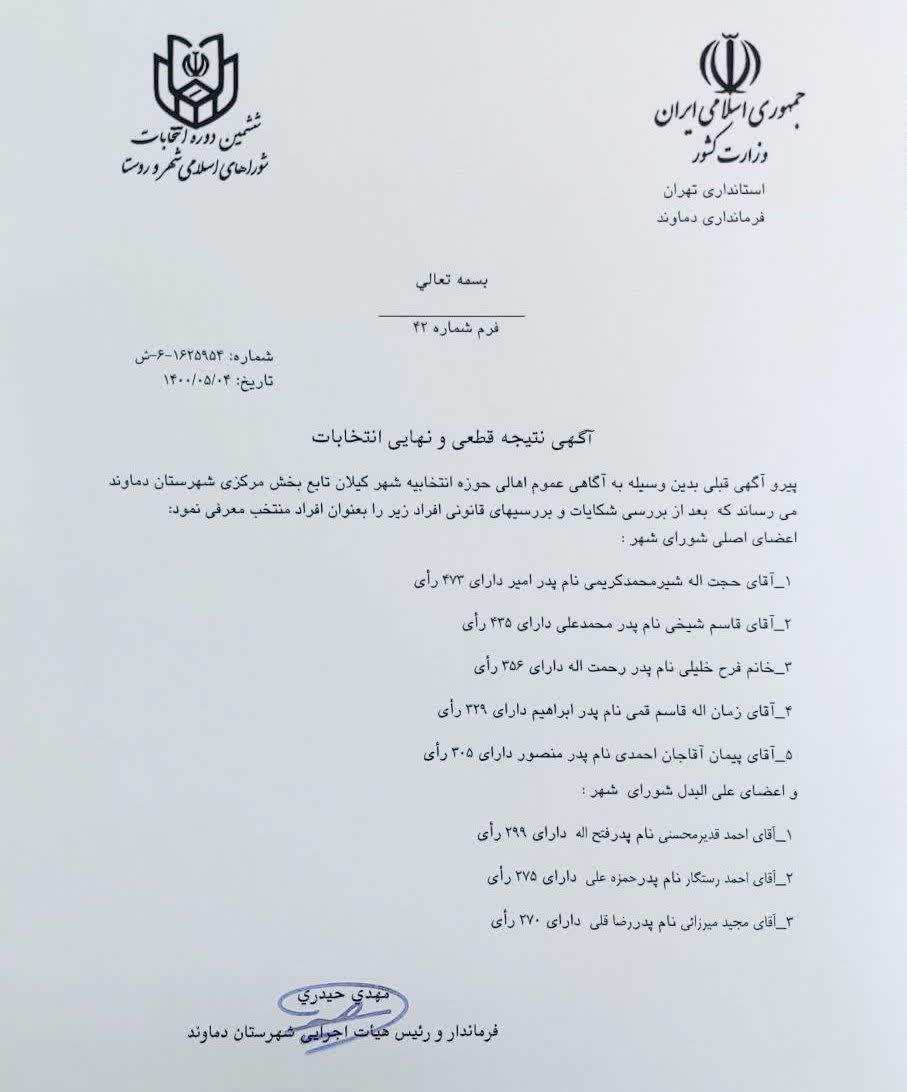 به گزارش روابط عمومی فرمانداری شهرستان دماوند، آگهی نتیجه قطعی و نهایی انتخابات شهر کیلان منتشر شد.